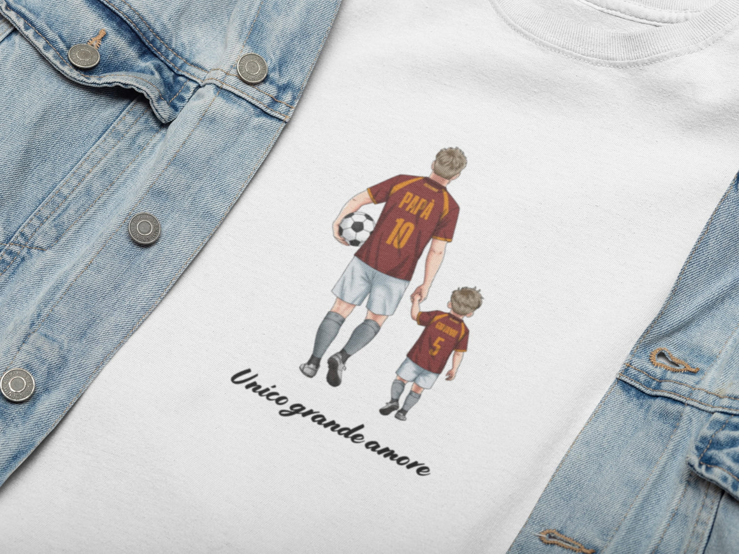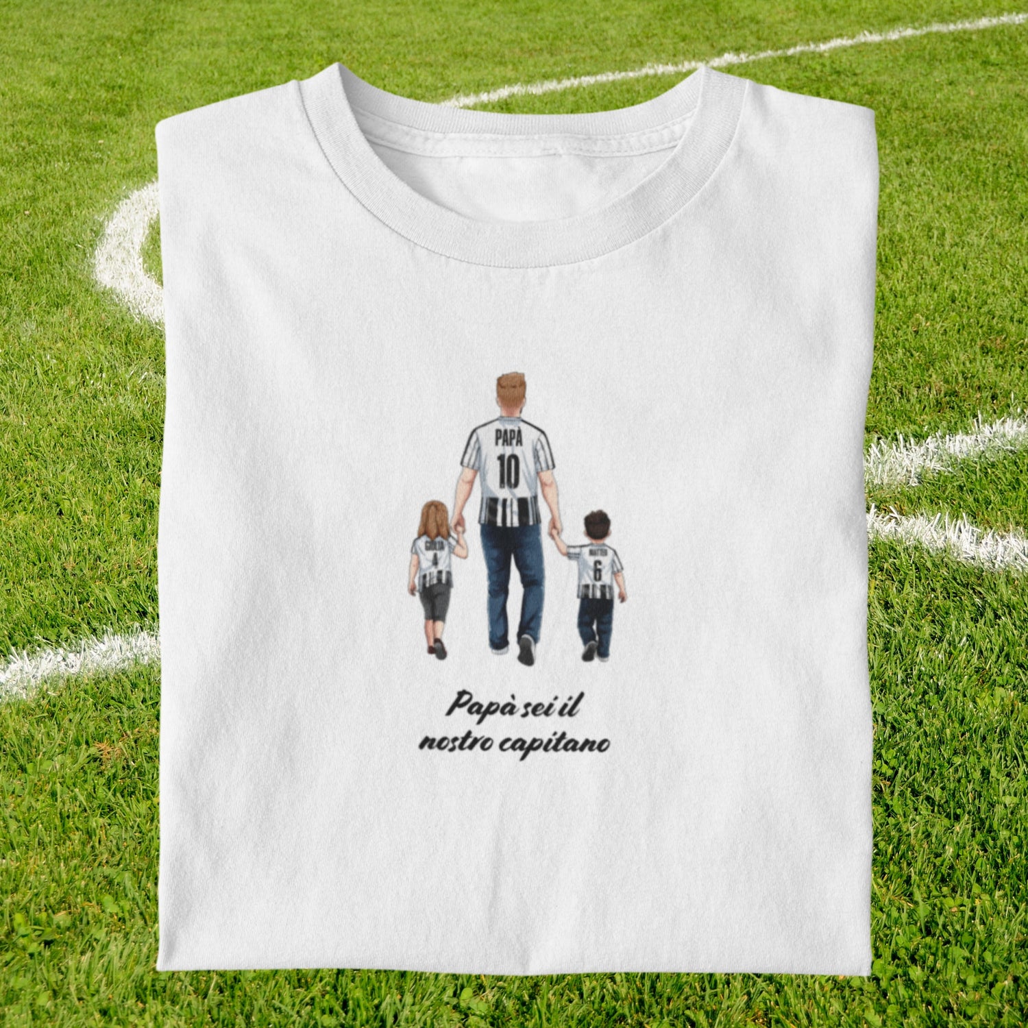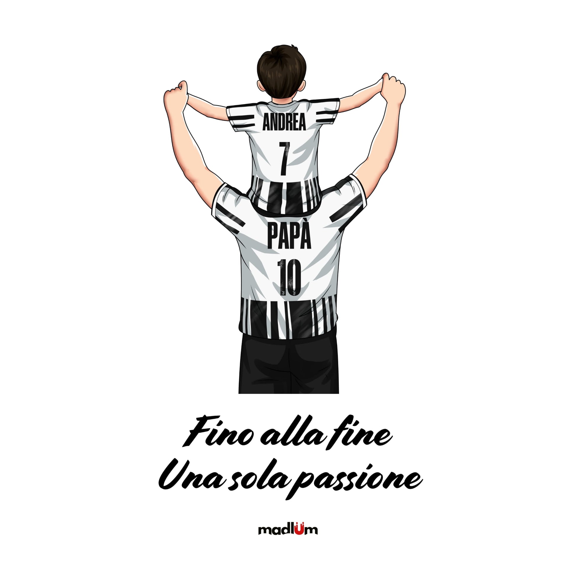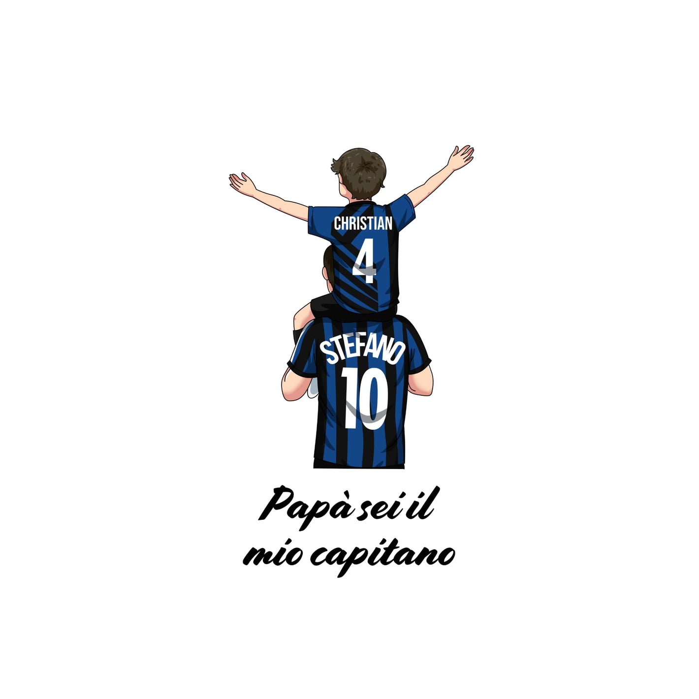 Con questo ritrattino personalizzato a tema calcio trasformi padre e figlio (o anche tutta la famiglia) in un’illustrazione unica, indossando i colori e la maglia della vostra squadra del cuore. Il disegno viene realizzato a mano, partendo dalle vostre foto, e poi stampato con cura su t-shirt o felpa: un regalo speciale per compleanni, Festa del Papà, Natale o per celebrare una stagione indimenticabile.